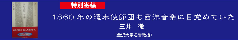 それによって、日本人が西洋音楽に馴染んでいき、その延長線上に、西洋音楽を当たり前とする後世の日本人の音楽活動がある。 その日本人が西洋音楽に目覚める発端が、記録上、ペリー提督の黒船艦隊、そして万延元年の遣米使節団にあったのだった。 |